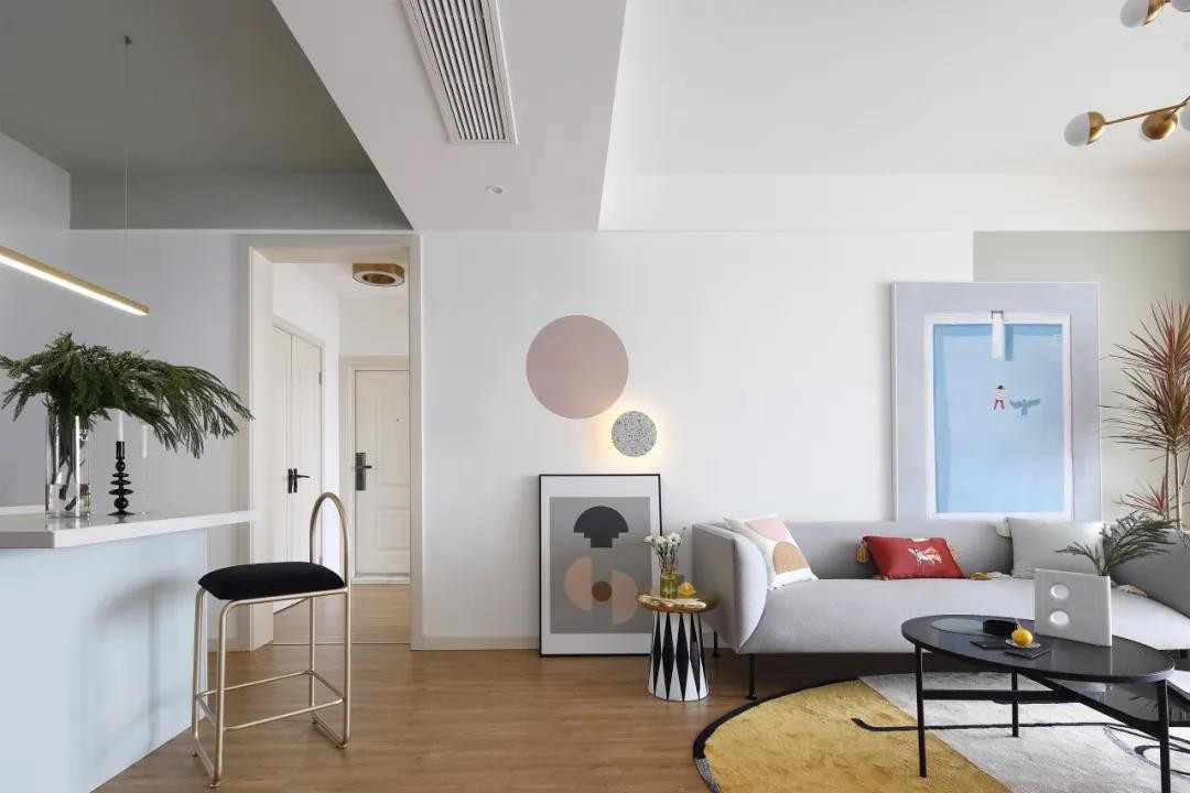 沙發(fā)墻潔凈的墻面加入白色與灰色的雙色設(shè)計(jì),掛放一幅極簡(jiǎn)的掛畫,左側(cè)還有兩盞圓形的壁燈。灰色布藝沙發(fā),還有鮮艷活