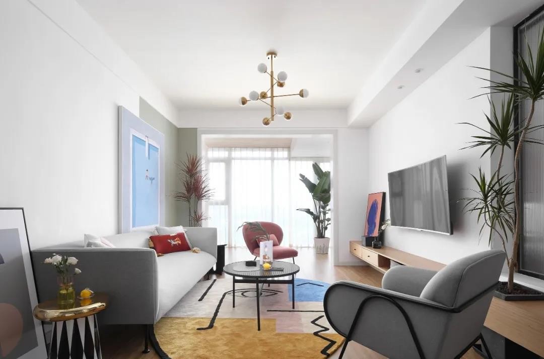 粉色休閑椅、在掛畫與地毯、綠植也是加入了粉色的元素,使得簡(jiǎn)約的空間更加浪漫雅致。頂上一盞金屬色的吊燈,則是增添了空間的華麗檔次感